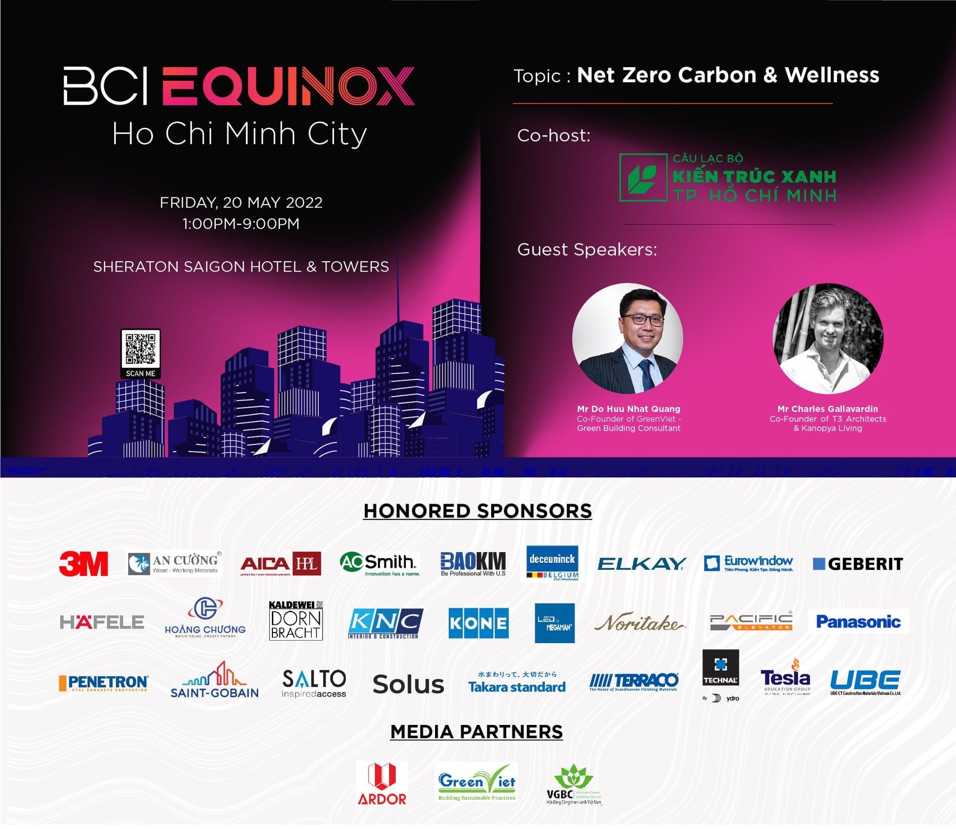 Sự kiện BCI Equinox 2022 với chủ đề Net Zero Carbon & Wellness sẽ được tổ chức vào ngày 20/05/2022 tại khách sạn Sheraton Sài Gòn, TP.HCM. Đây sẽ là một trong những sự kiện triển lãm được mong đợi nhất ngành kiến trúc và xây dựng năm 2022.